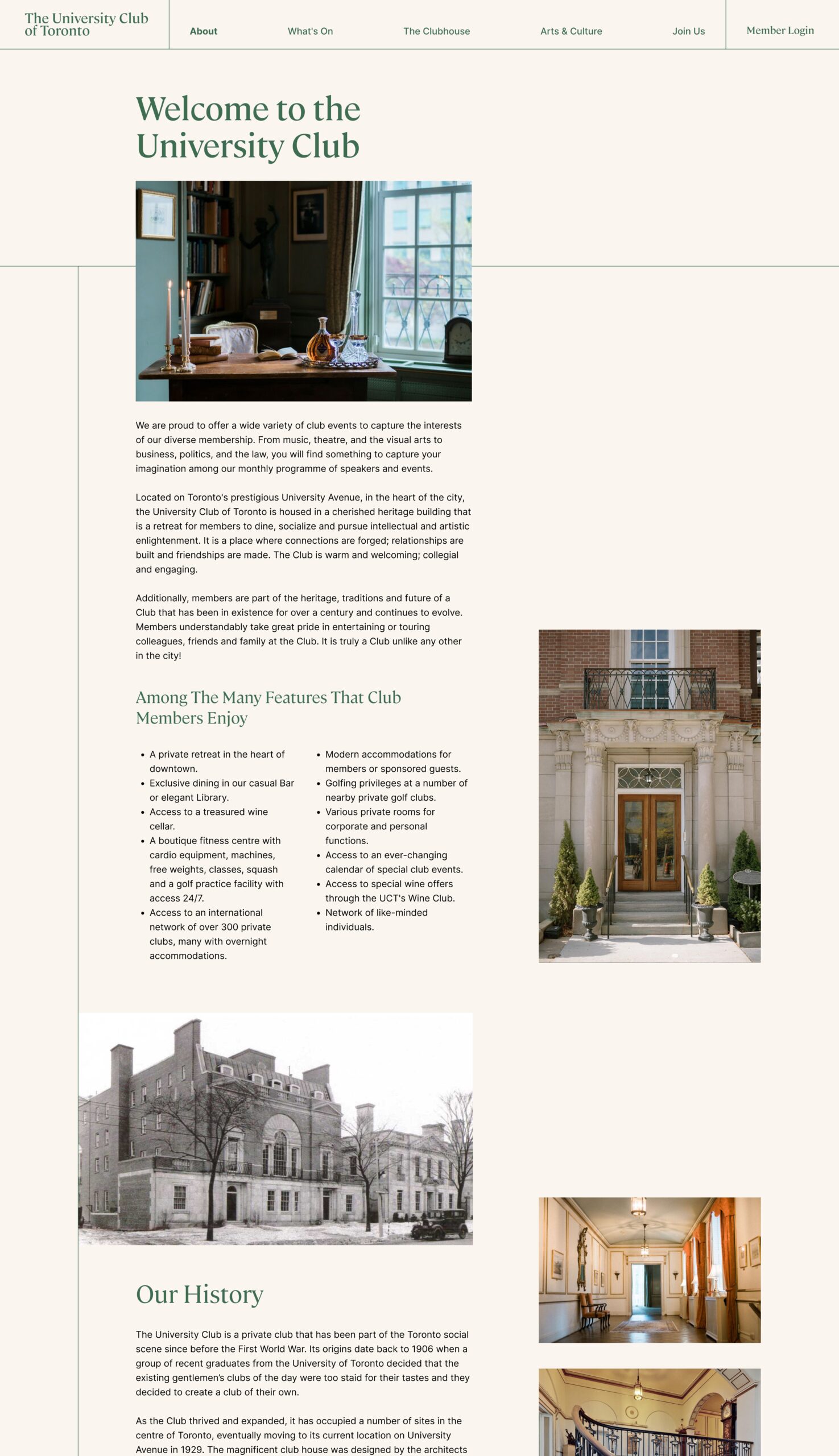 Design-wise, we embraced the Club’s unique blend of tradition and modernity. Classic typography and editorial layouts echo the academic and artistic roots of the space, while rich photography and ambient video capture the mood and material beauty of the clubhouse itself. Subtle interactions and transitions, never flashy and always intentional, add polish and movement to the experience.