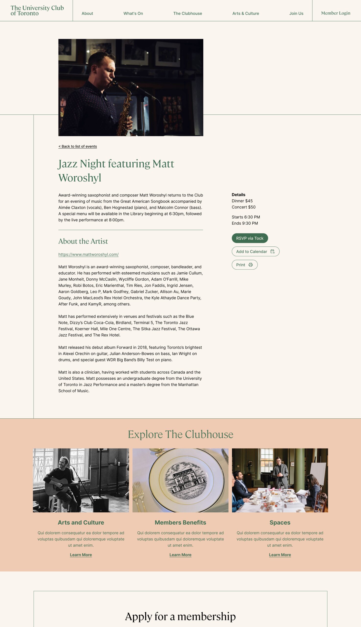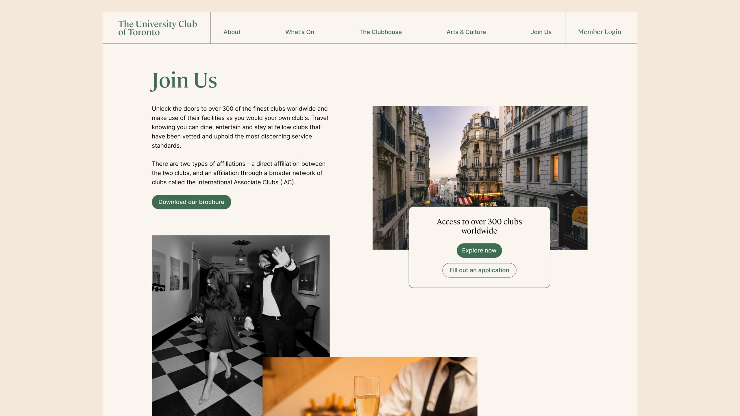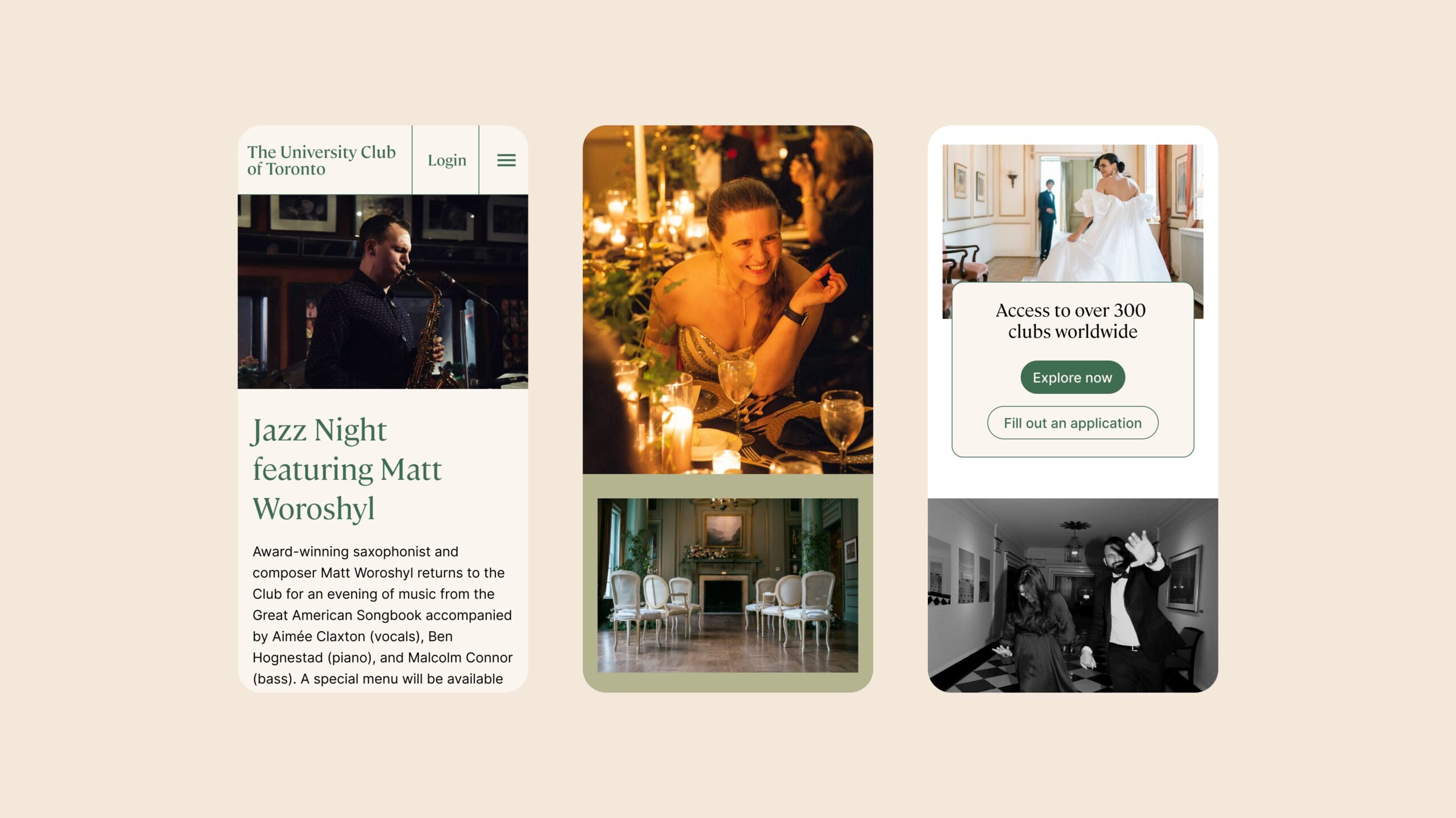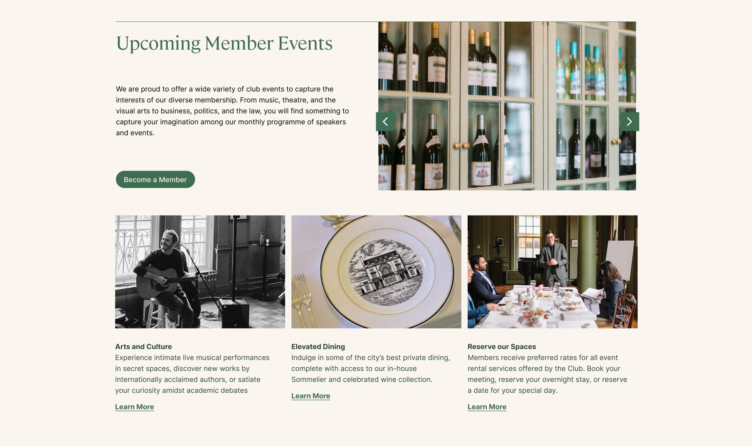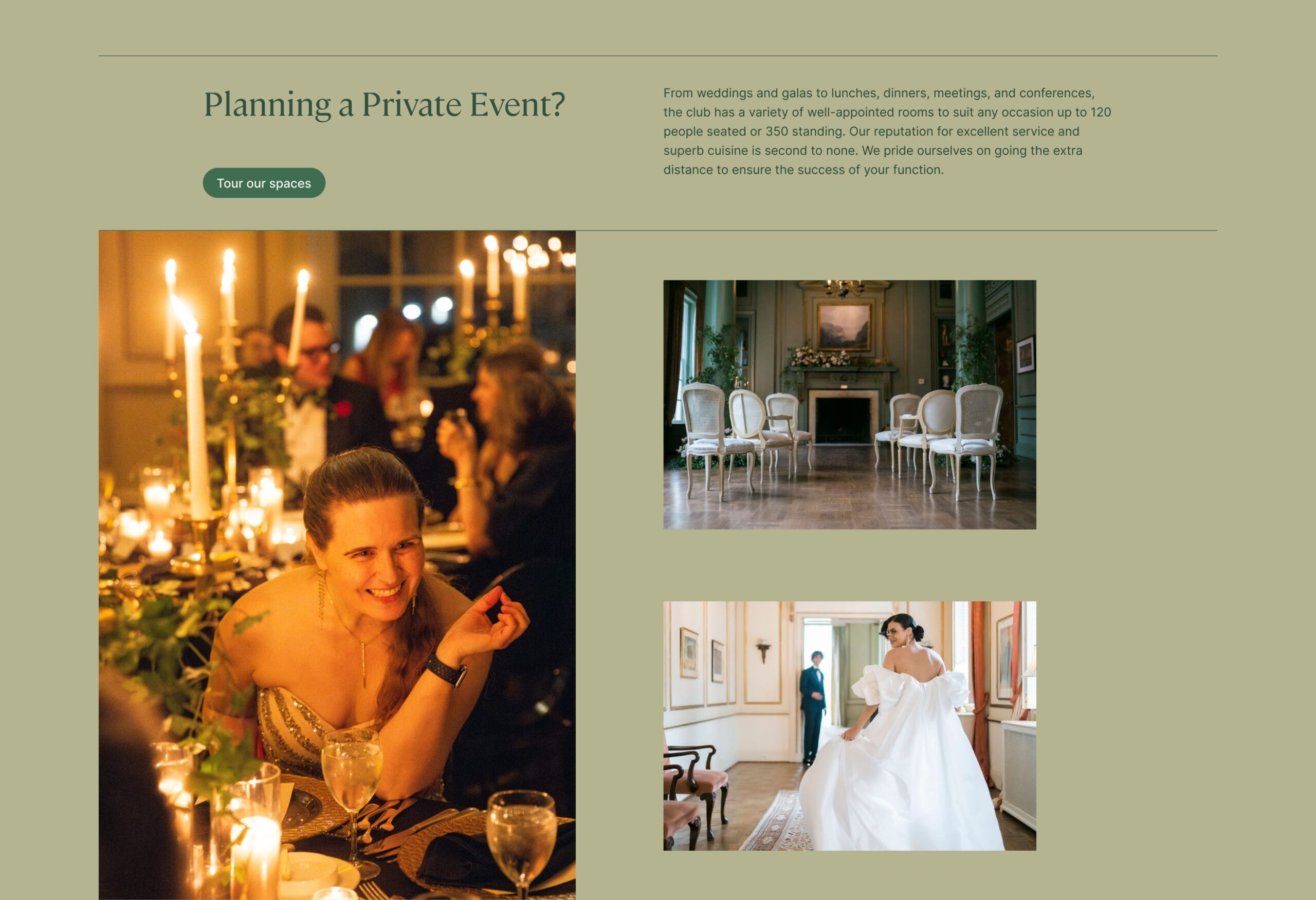 We began with strategy, mapping out a new site structure that reflects how different audiences navigate and connect with the Club. From curious prospective members to long-time patrons booking a dinner or cultural event, each journey was thoughtfully considered. With clarity and elegance as our guide, we built a flexible architecture that ensures every piece of content—from event listings to venue details—has a natural place and purpose.