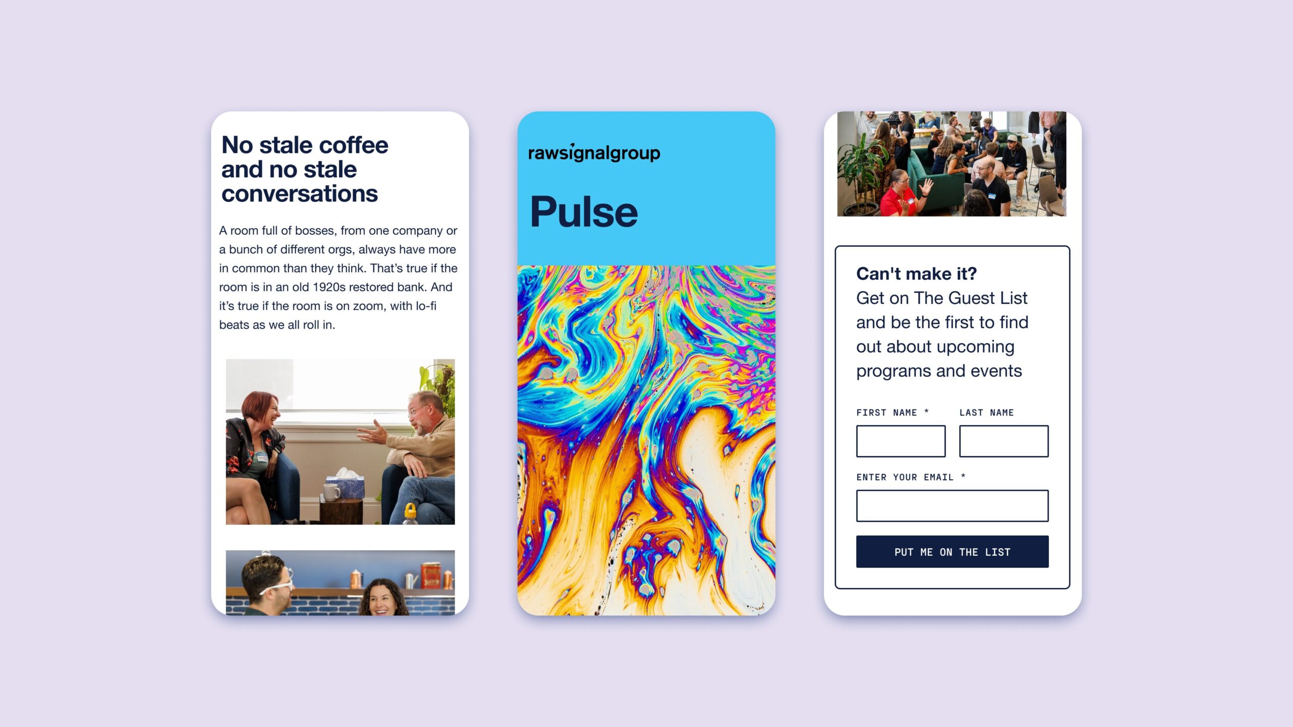 Over the course of a comprehensive discovery and exploration process, we looked at RSG’s business and the world in which it operates from every angle, building deep empathy with their community (a savvy, and bullshit-averse group); mapping out rich and engaging user journeys; identifying opportunities to surprise and delight; and building out a toolbox of components that would empower the RSG team to deliver the right message to the right person at the right time. We also worked closely with RSG’s design team to extend the already well-defined RSG brand into new touchpoints and digital applications.